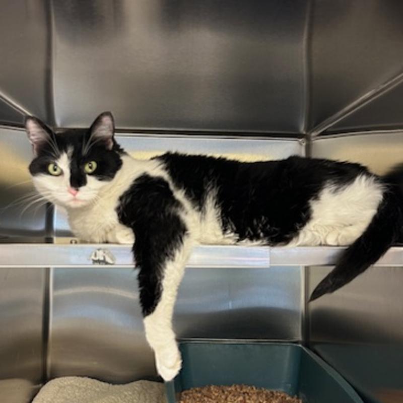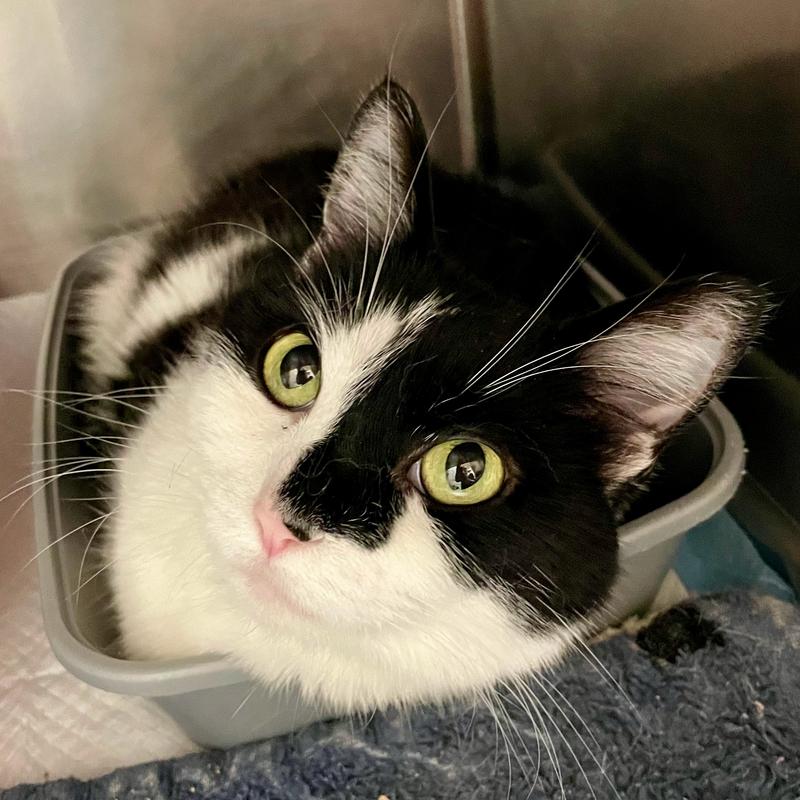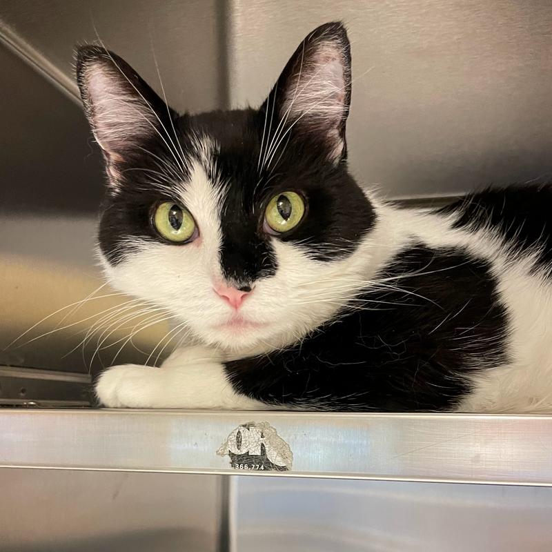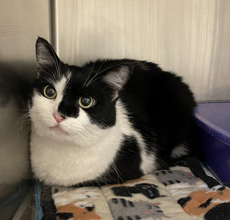Harriett - this stunning lady sports a short black and white coat and has an adorable half black/half white face. At just 7 years old, this girl has proven herself to be a pretty chill cat. She`s been fairly mellow at the shelter, not too fussed about all of her new roommates and all of the new people in her life. She`s happy to take it all in, quietly and calmly, accepting all the love she can get. Sadly, Harriett`s last family was unable to keep her, but it`s not due to anything wrong with this perfect girl. Help us find her the perfect home for her to continue to grow and sparkle. If you, or someone you know, would like a perfectly sweet, good natured cat to share some happy days with, come and meet Harriett!