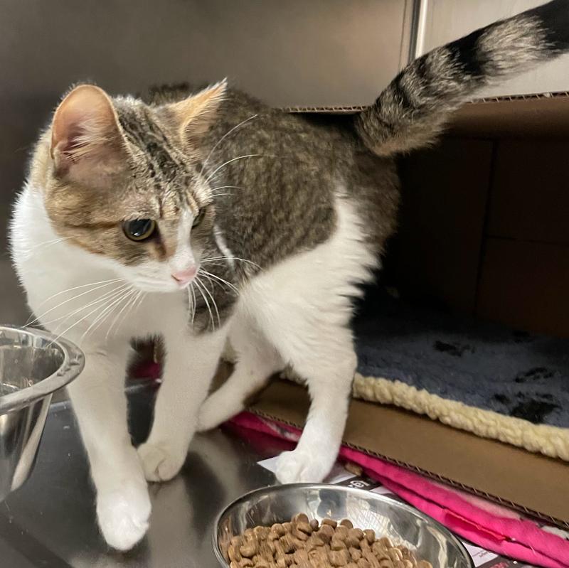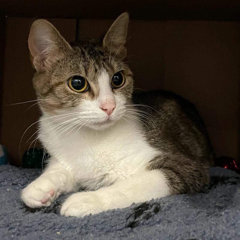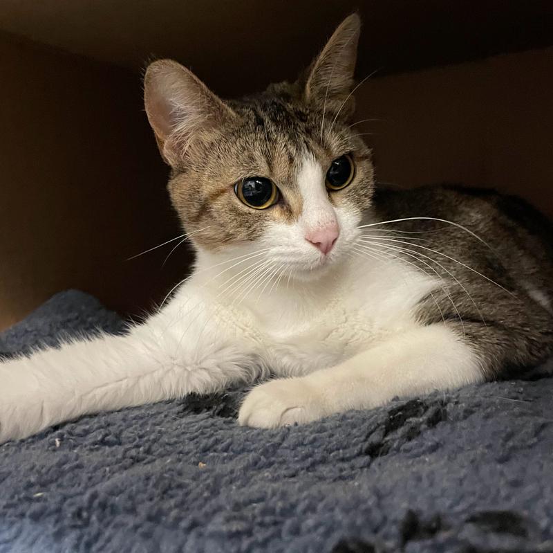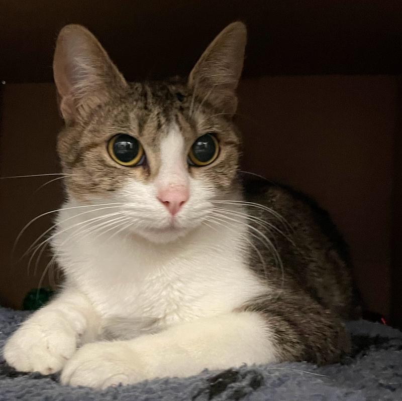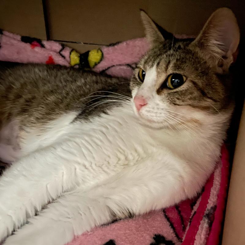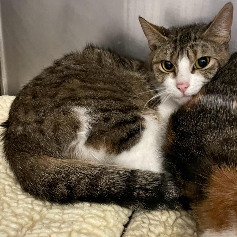Charlotte is a gorgeous white and brown tabby girl with a soft short coat and a sweet pink nose. Charlotte and her sister, Friday, came to the shelter after their owner realized that cats weren`t the right kind of pets for their family. These two girls both have bunny-soft fur and are understandably confused at the change of environment. They are looking for a loving forever home with people who will make them feel safe and loved. They will need a little time to decompress, but they have already shown that they love laps and they know how to make great biscuits. If you have room for these two love bugs, stop by Riverdog Astoria to meet them where they are staying in the big catio upstairs (1389 Duane St, 10-6 Mon - Fri, 10-4 Sun)