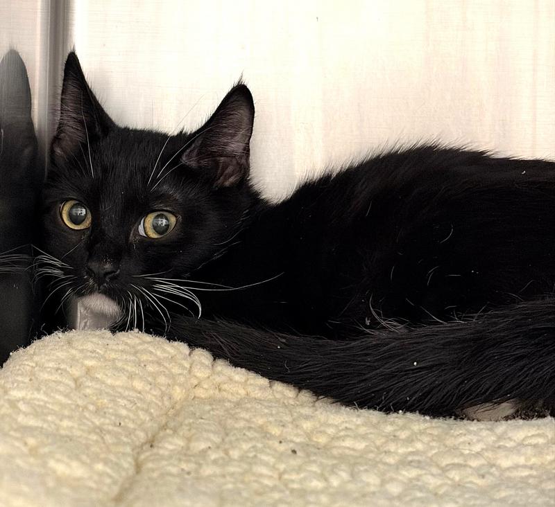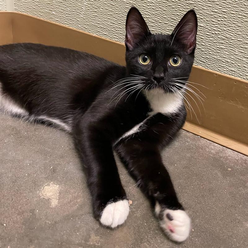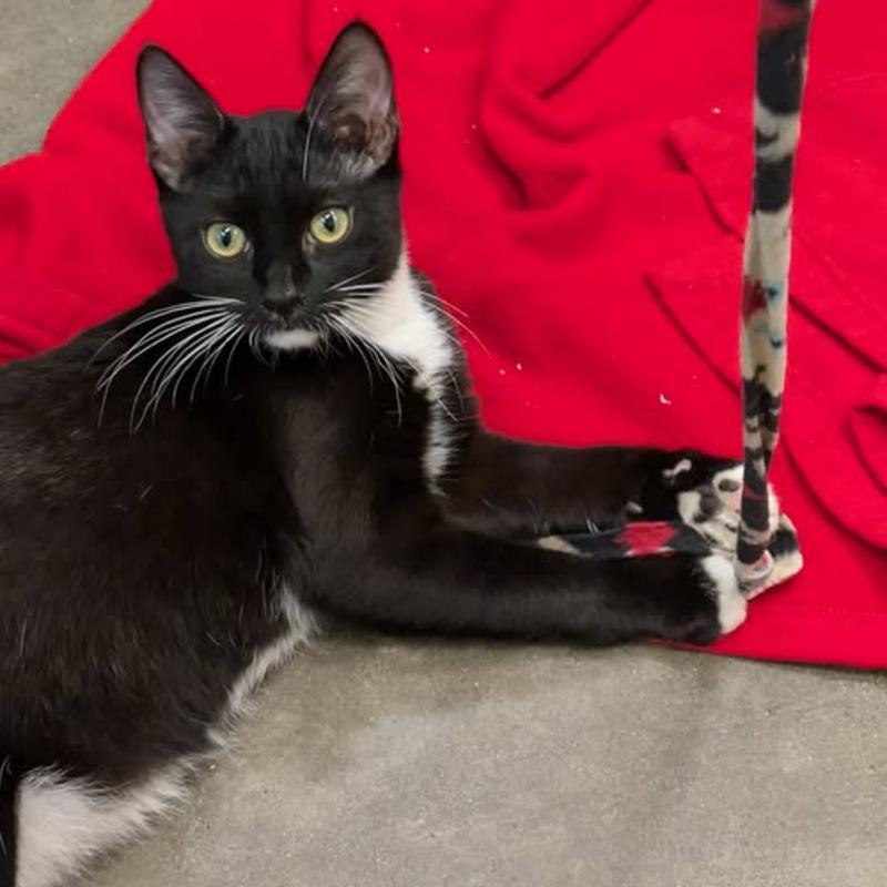 The Prince of Whiskers (aka Graham) is a delightful young boy with a short black and white coat and amazing whiskers. He is always eager to show off his many attributes, including high jumps, toy selection, and of course his spectacular whiskers that shift into alert mode with every new toy! One of his hobbies is to climb up to the wand toy bin, each time choosing a different toy for the volunteers to bring down and then proceeds to tackle the toy with wild abandon. He will make a wonderful companion for a family with or without children who are willing to play and love him.