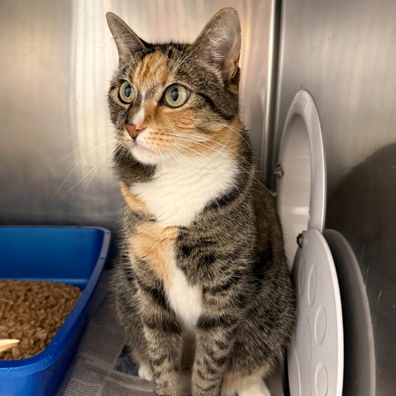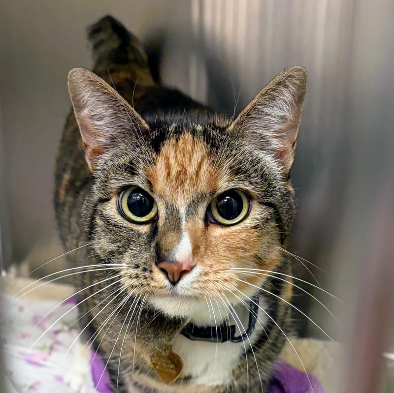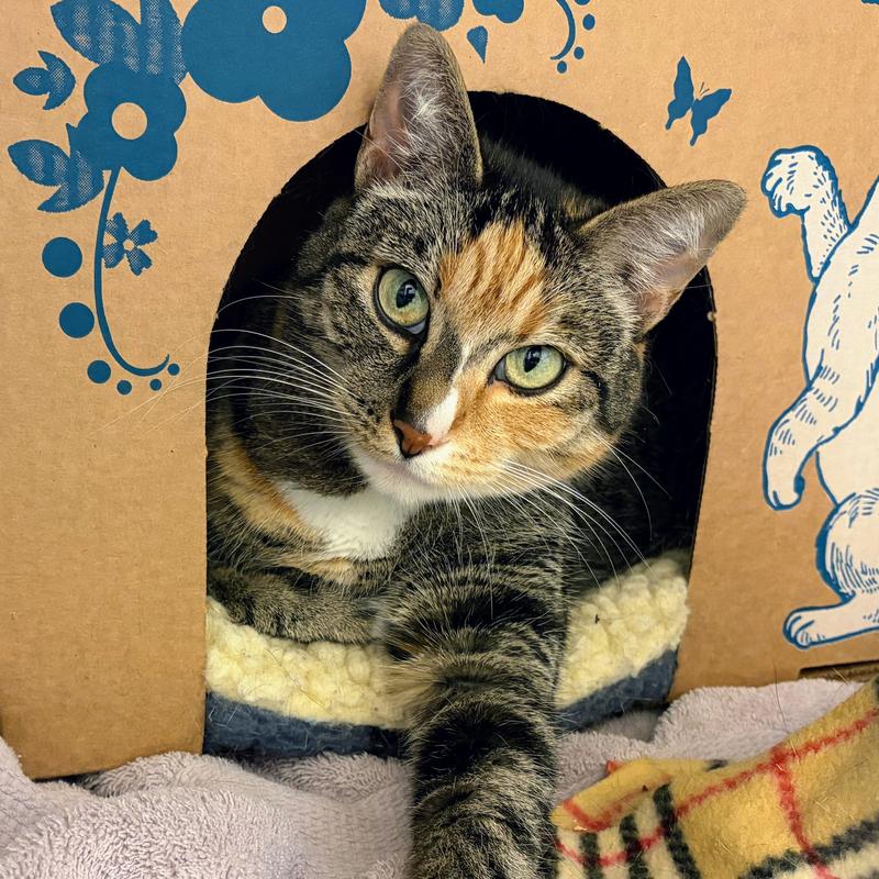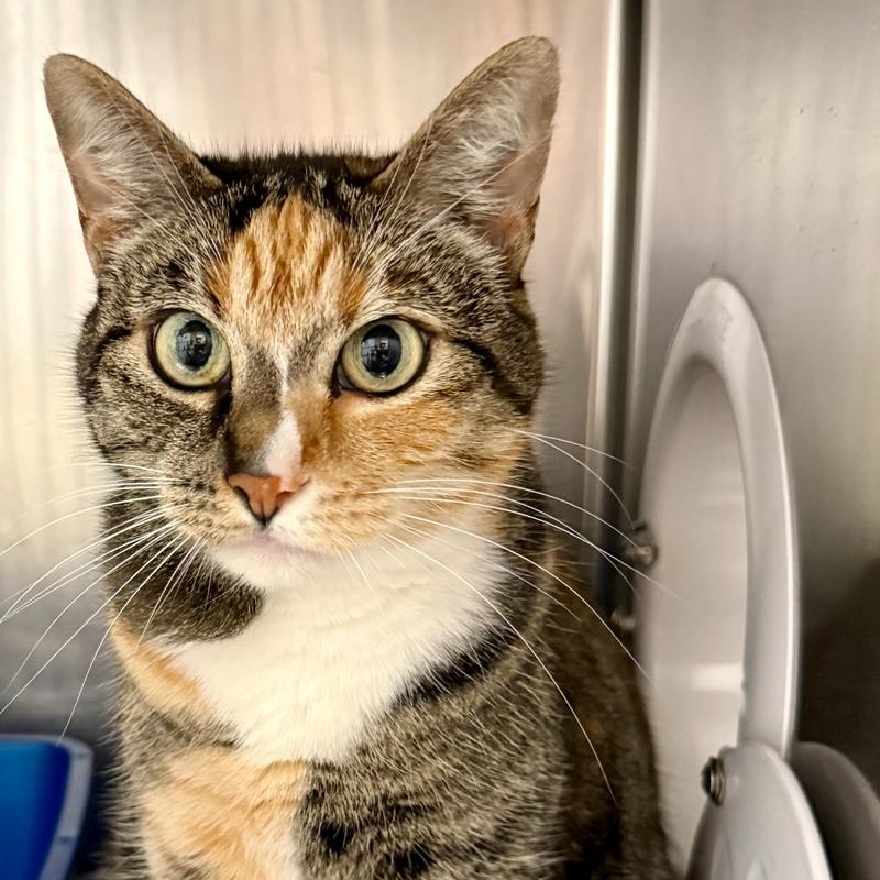 Roxie is a 6-year-old calico queen with the most striking green eyes and a quiet, thoughtful presence. She’s the perfect size for a cozy lap and a sunny window perch.